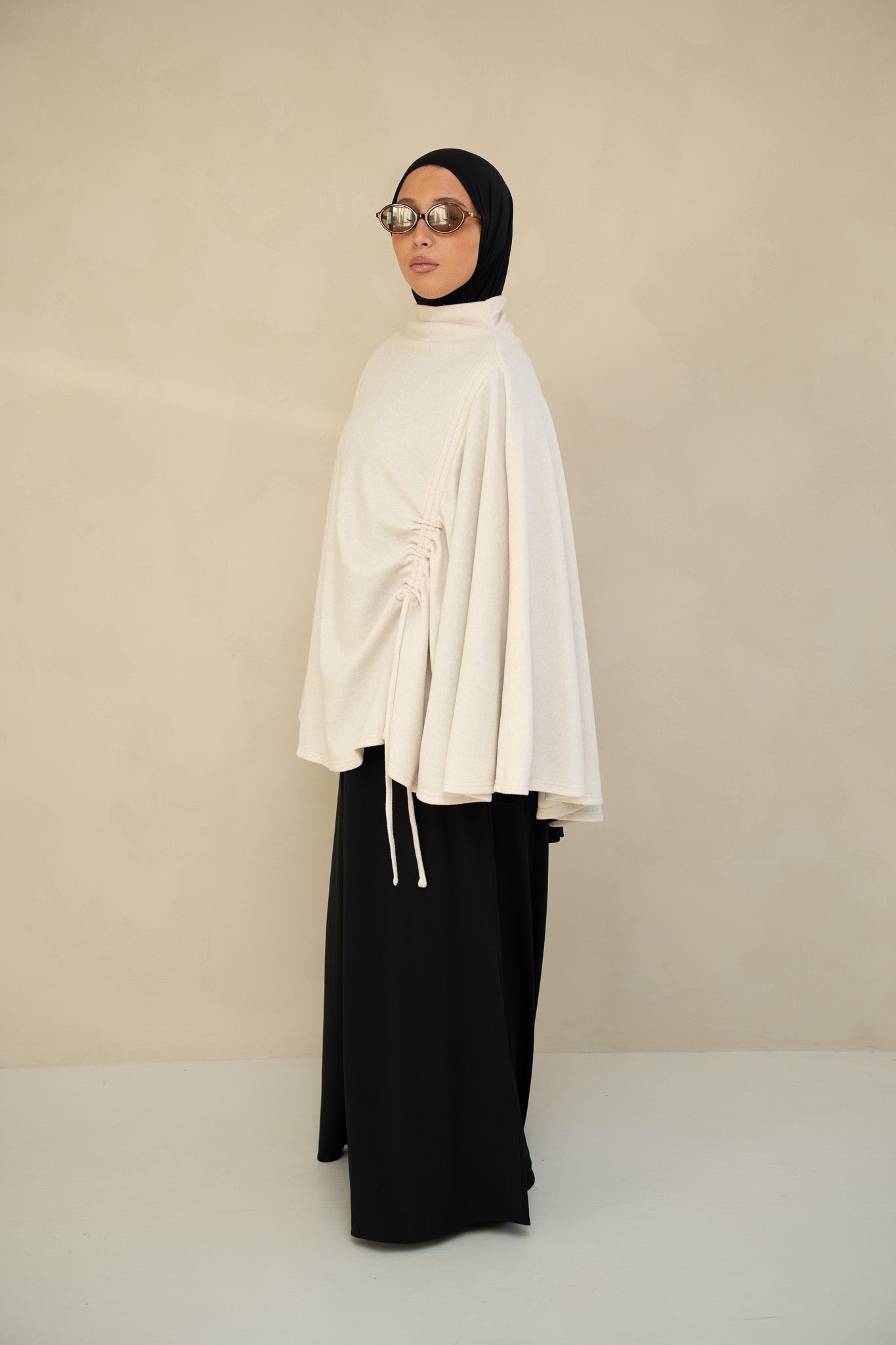 Featuring chic lace detailing on the sides and a higher neckline, this poncho adds a refined, sophisticated touch to any outfit. Perfectly paired with a khimar set from our collections, it creates a polished and effortless look.