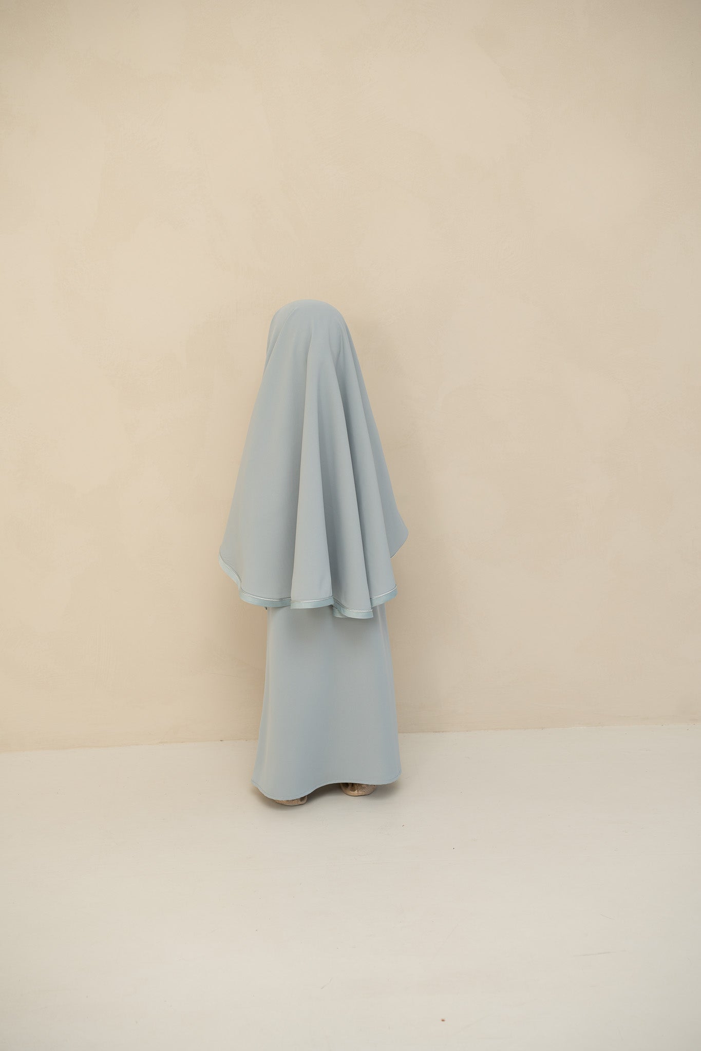 Introducing the Silk Edge Abaya & Khimar Kids Set: the perfect way for little ones to match in elegance with mom, sister, or cousin. Designed with luxury and refinement in mind, this set features satin fabric with delicate trim details on the khimar and sleeves, along with a chic collar detail at the neckline.