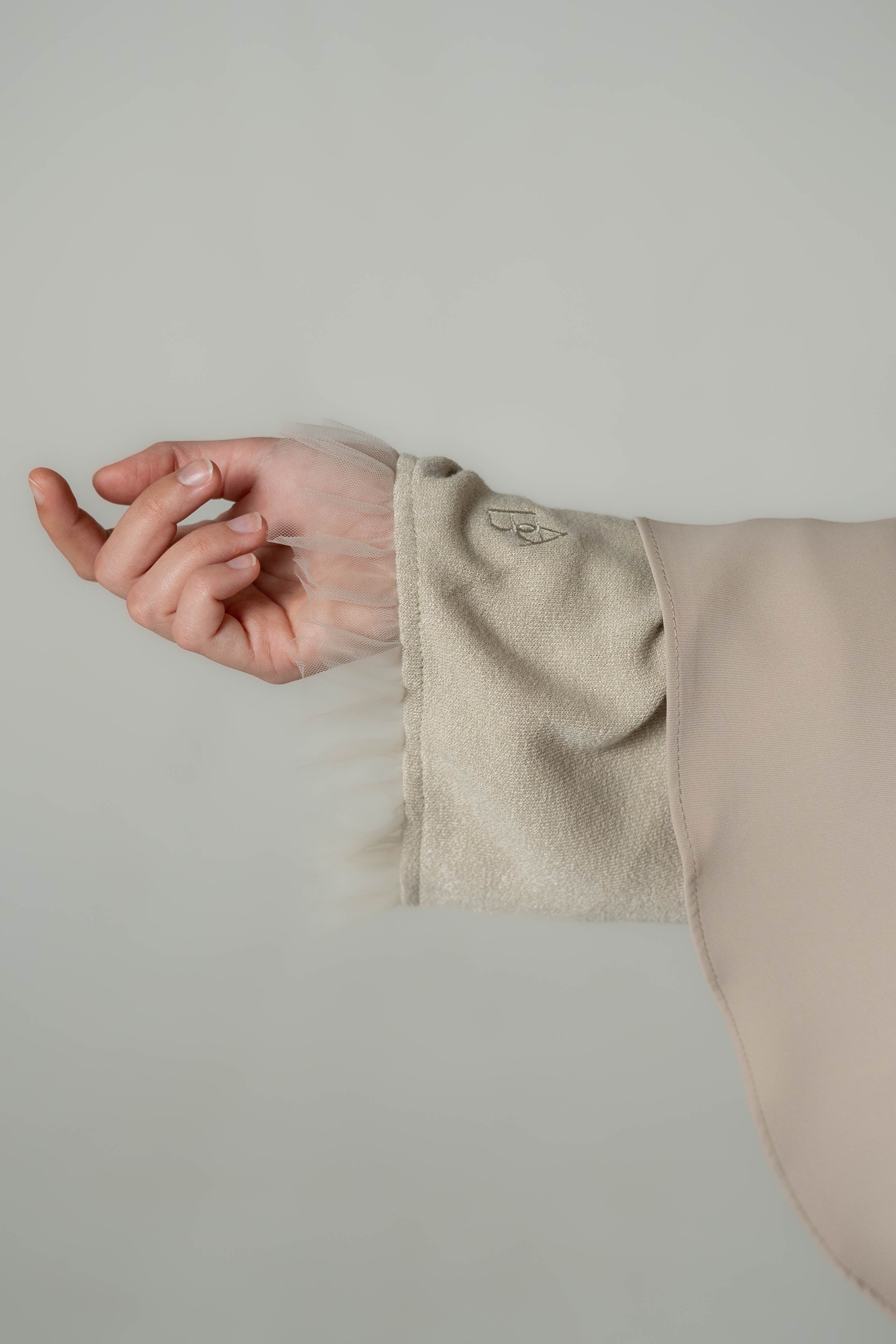 Available in three stunning autumn shades, it can be worn as a standalone dress or as a complete set with the matching hip khimar. Featuring delicate sheer mesh details at the sleeve ends for an elegant touch.