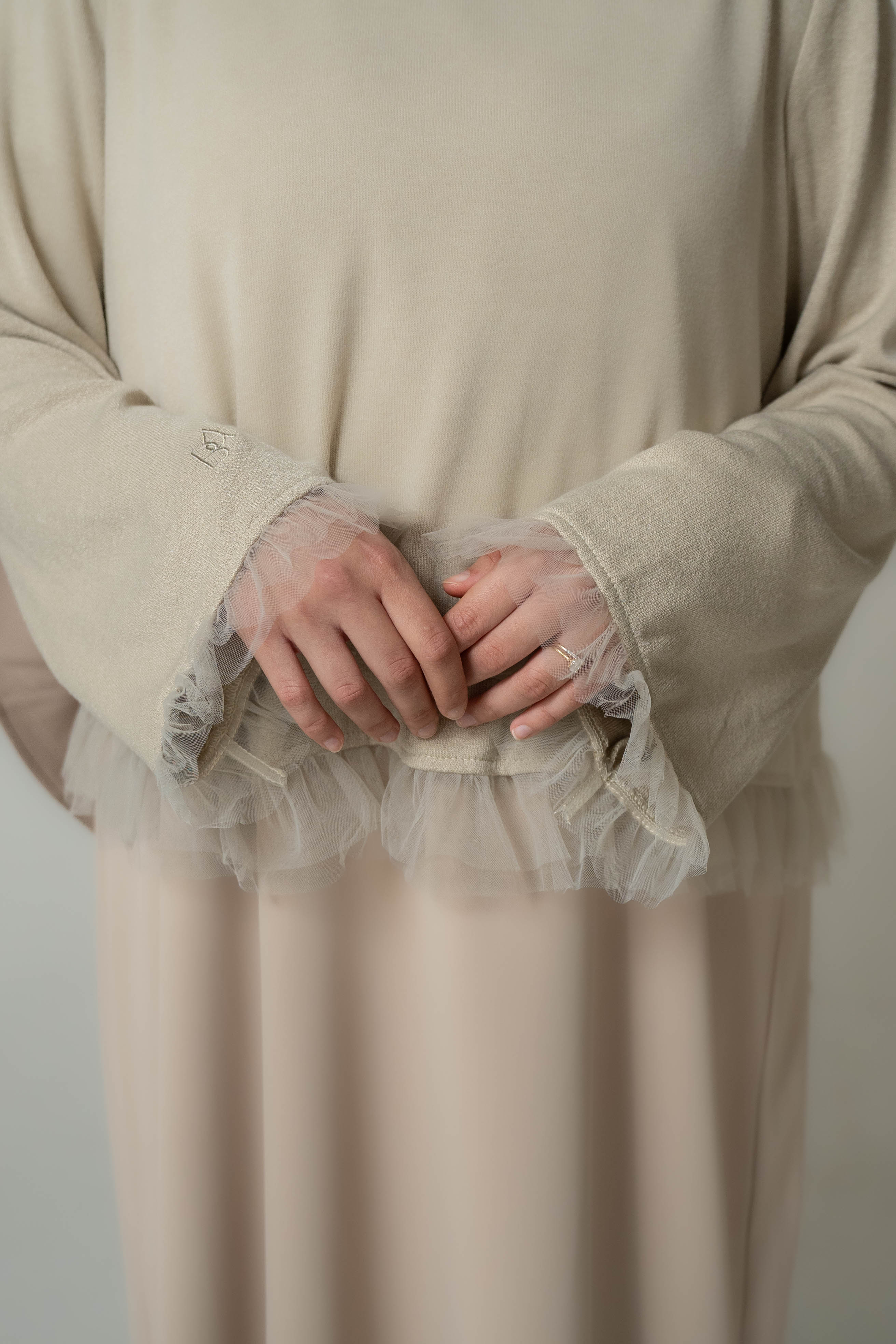 Sweater Mesh Abaya & Khimar Set: a bestseller from our previous Fall Collection! This unique piece combines a cozy sweater seamlessly attached to the abaya, so no separate items are needed.
