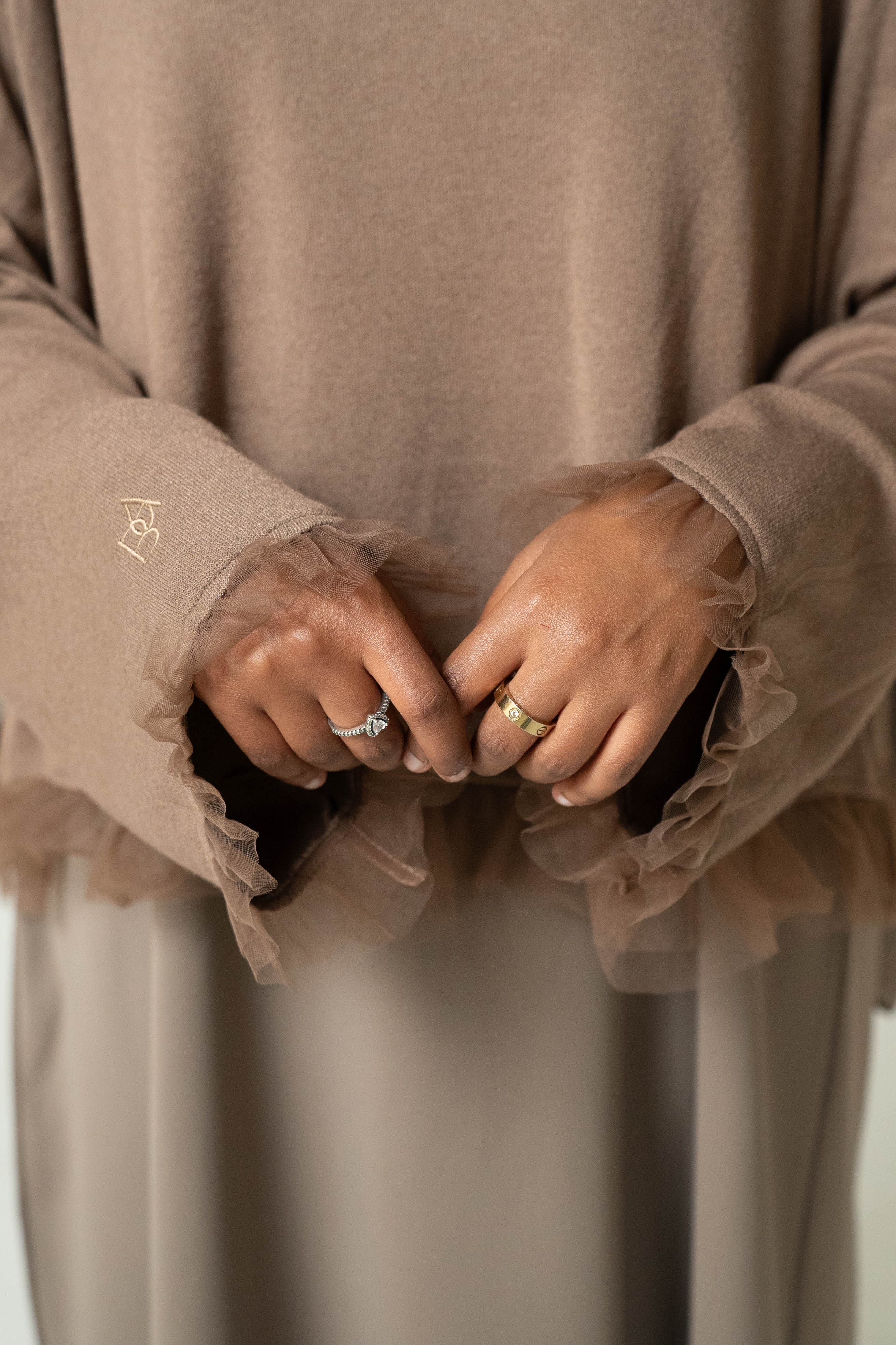 Sweater Mesh Abaya & Khimar Set: a bestseller from our previous Fall Collection! This unique piece combines a cozy sweater seamlessly attached to the abaya, so no separate items are needed.