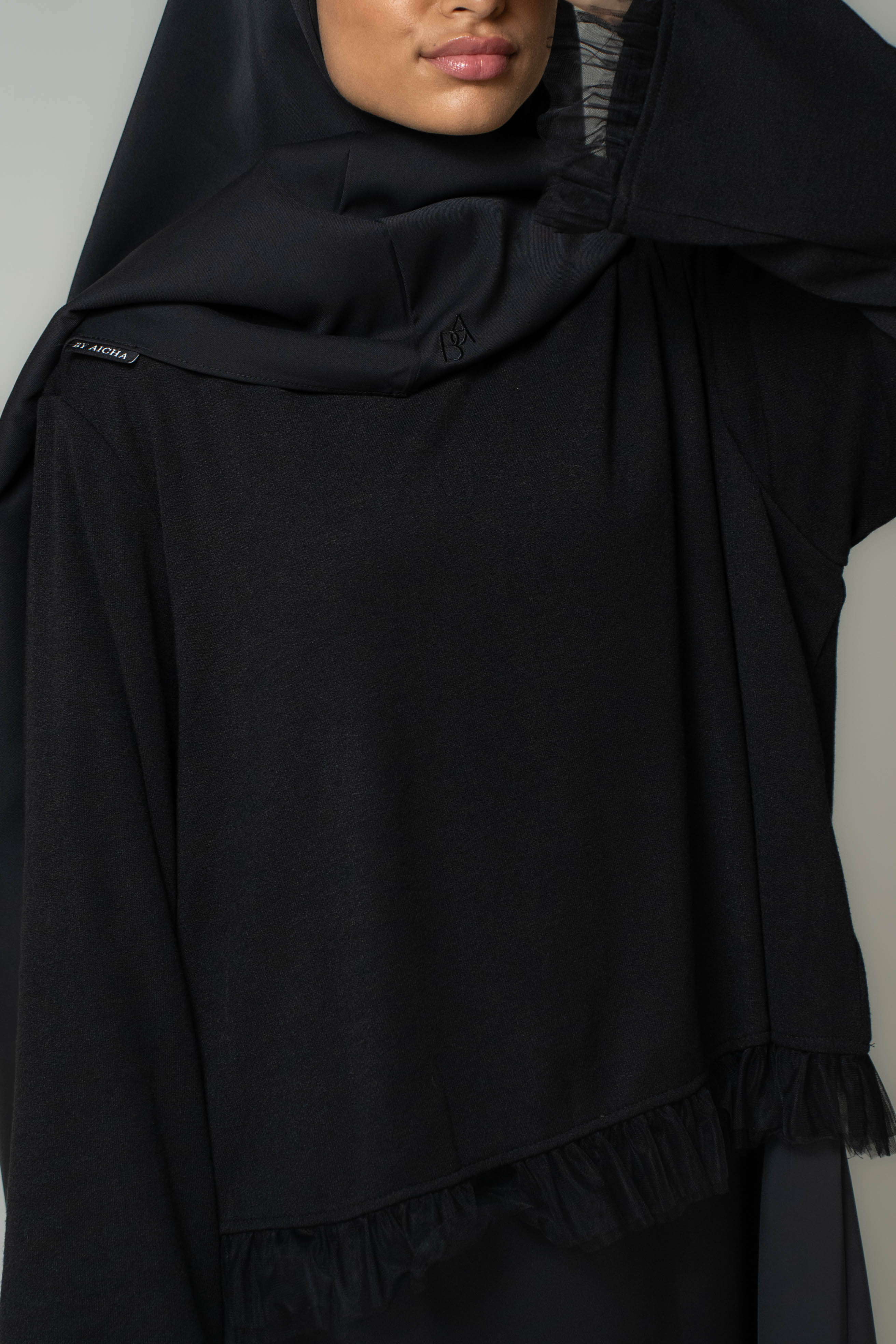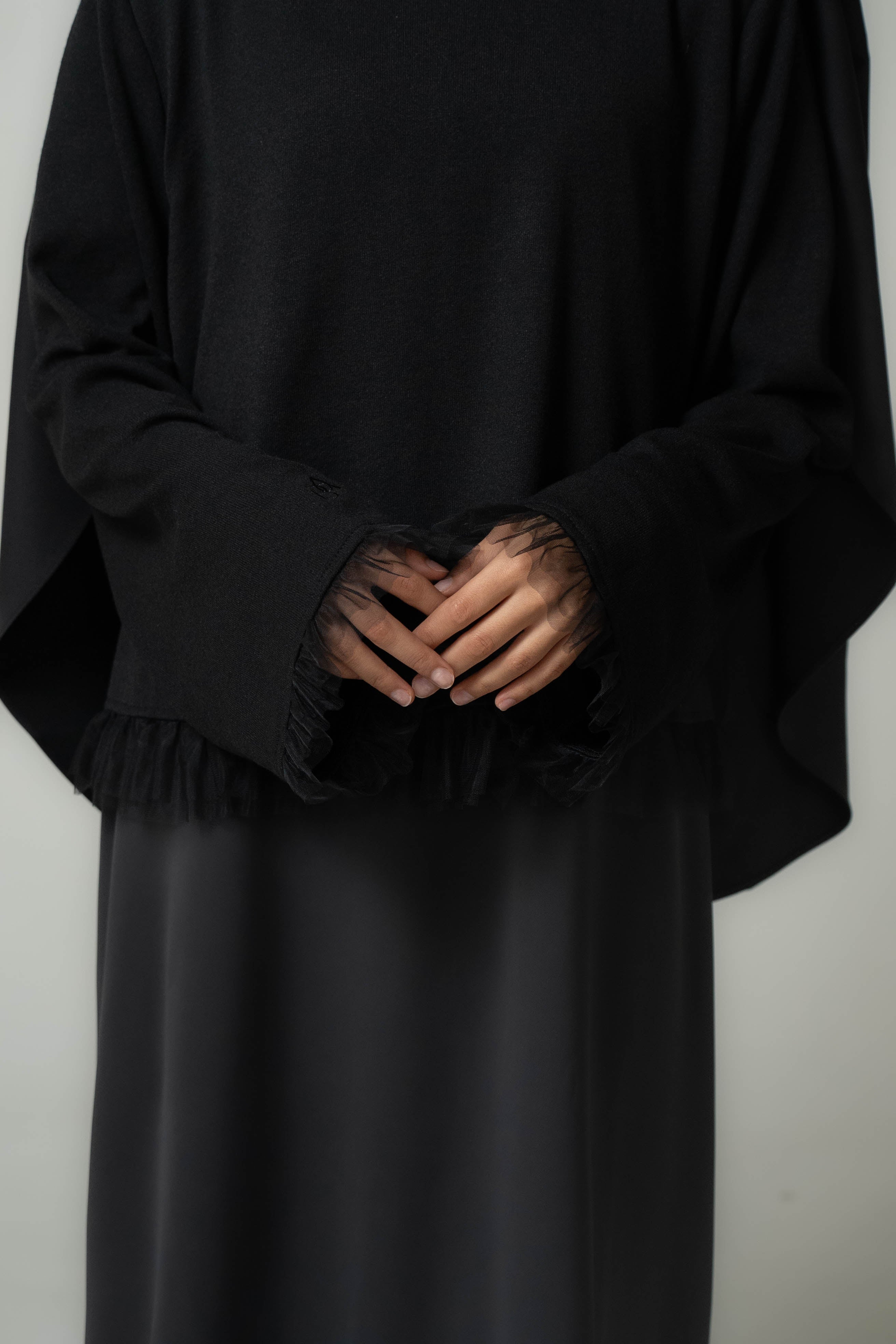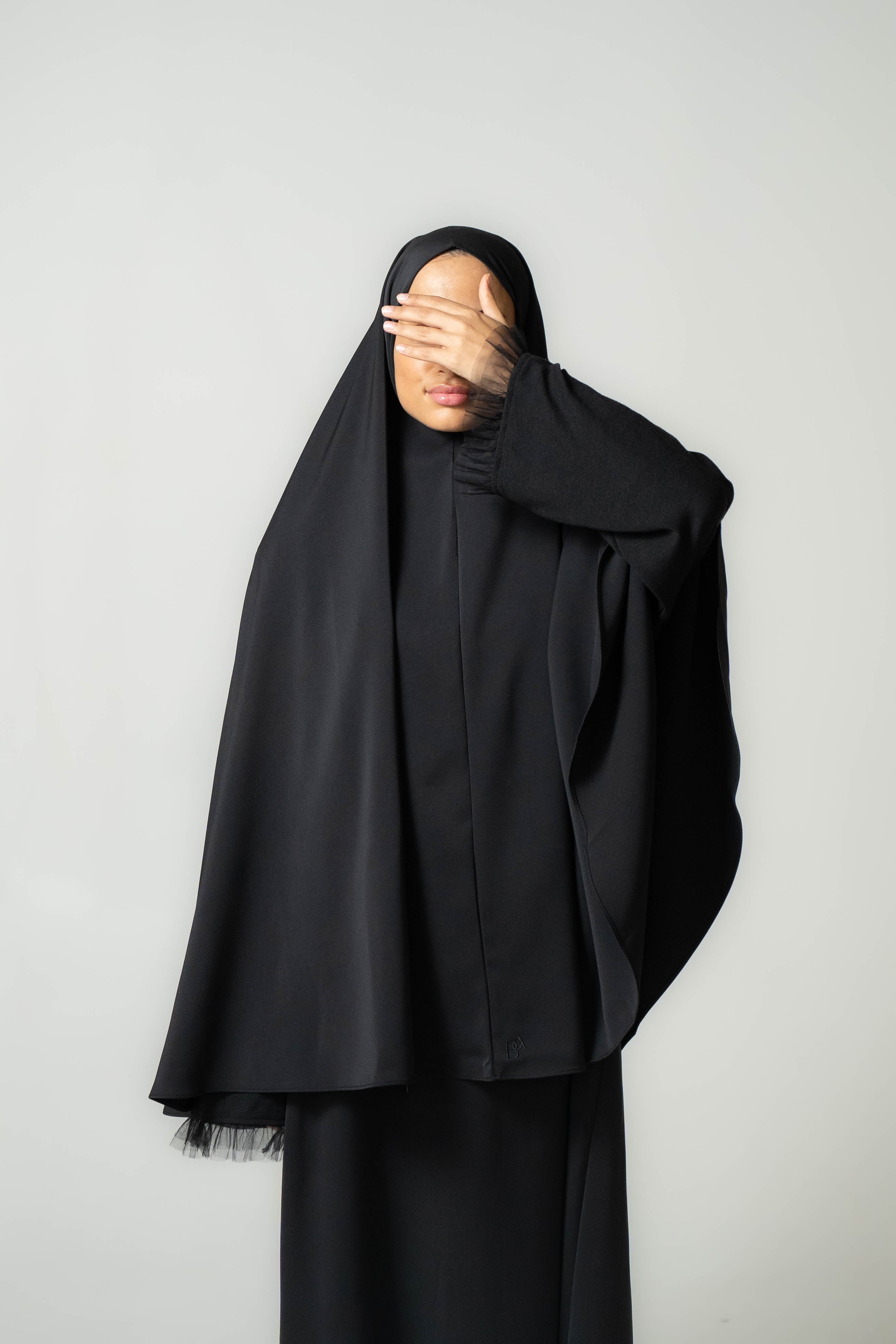 Sweater Mesh Abaya & Khimar Set: a bestseller from our previous Fall Collection! This unique piece combines a cozy sweater seamlessly attached to the abaya, so no separate items are needed.